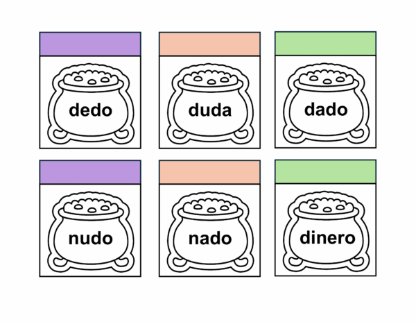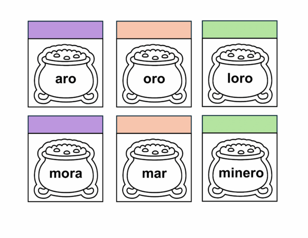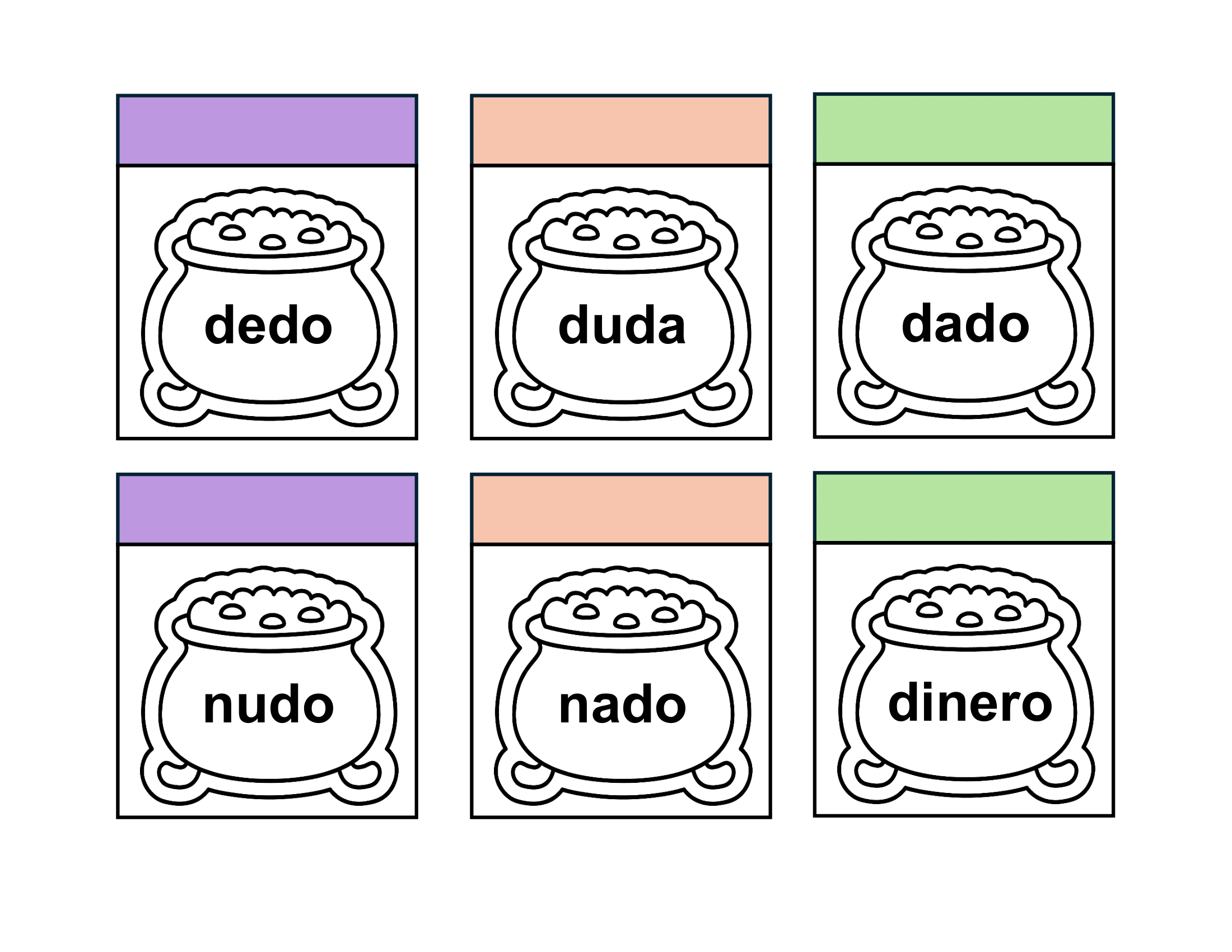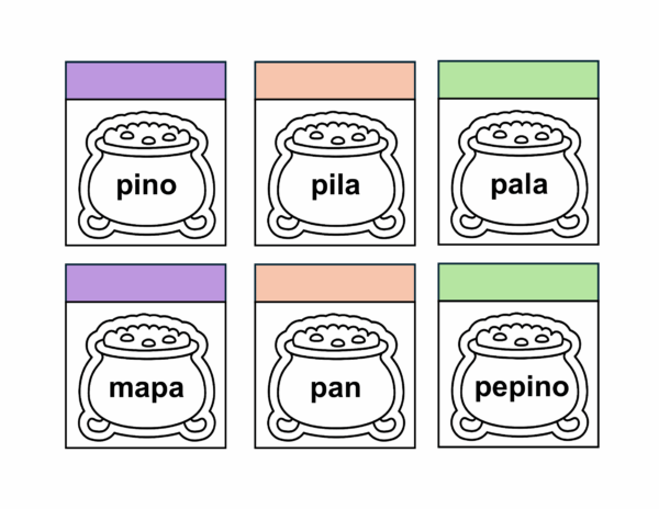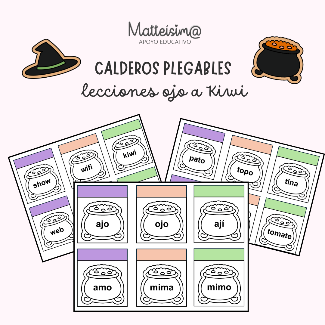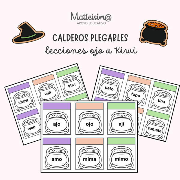 PDF con calderos que contienen palabras de las lecciones ojo a kiwi para que tus estudiantes puedan leer, colorear, plegar y dibujar el contenido de lo leído o pegar recortes en el espacio otorgado.