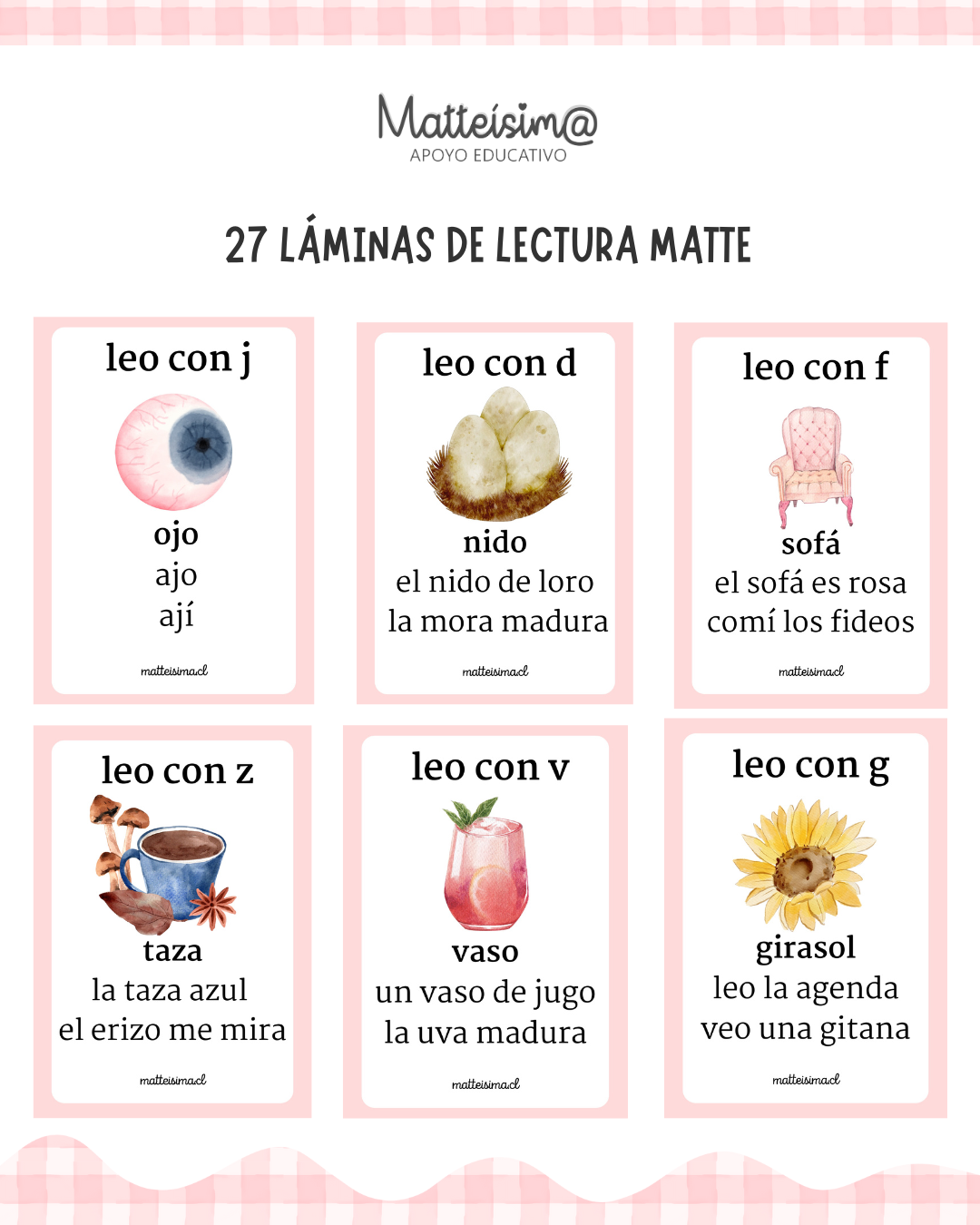PDF con 27 láminas en tamaño carta para practicar la lectura en silencio y en voz alta de palabras claves , frases y oraciones de la progresión Matte capítulo minúsculas.